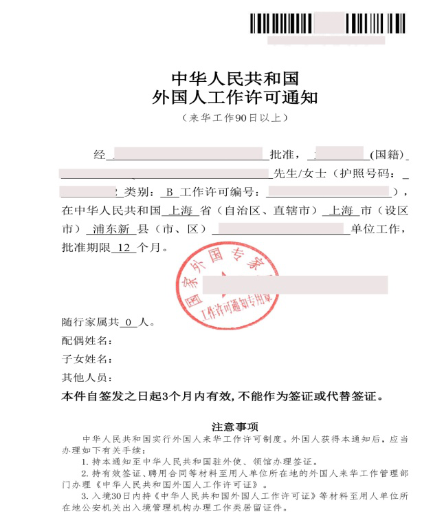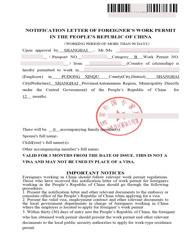 外国人凭《外国人工作许可通知》及其他所需材料到中华人民共和国驻外使、领馆申请Z字签证或F字签证或R字签证。这个签证是30天的入境签证。